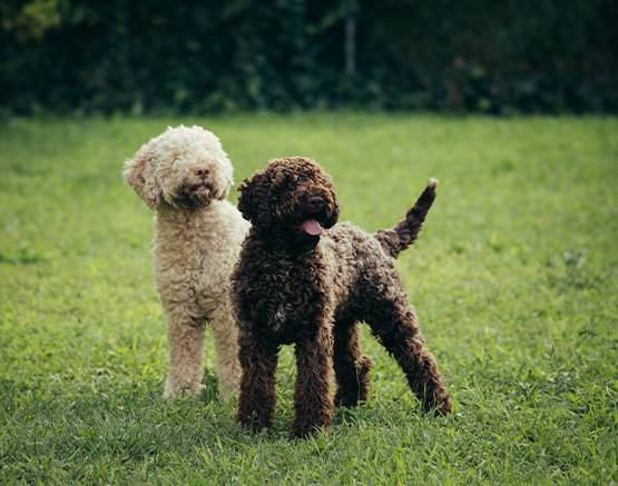 The Lagotto Romagnolo's coat is dense, woolly, and curly with a tight, ring-shaped structure and an undercoat that is water-impermeable. The breed does not shed in the traditional sense; instead, the hair grows continuously, which is why regular shearing and grooming are important to prevent matting. The coat is hypoallergenic and can come in a variety of colors, including white, various shades of brown, orange, and mold patterns. We are happy to provide you with advice and assistance on how to properly care for your beloved pet!